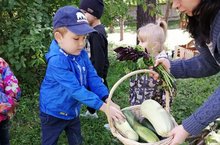 Весь наш дружный взрослый и детский коллектив сегодня собрал урожай. В нашем мини-огороде выросли кабачки, помидоры, картошка и огурцы!