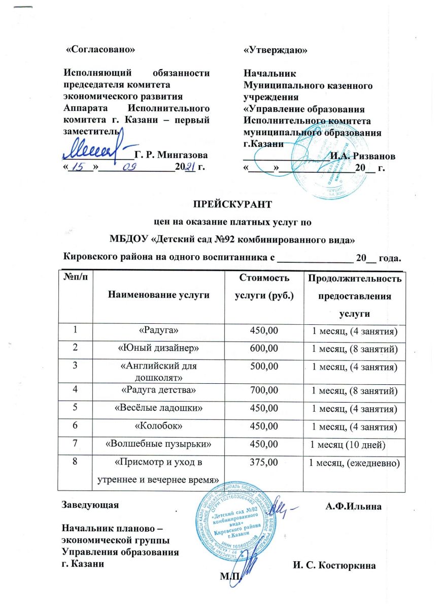 Прейскурант на оказание платных образовательных услуг в 2021-2022 учебном году