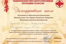 Нас благодарят... 21.01.2014 Национальный Союз каратэ кёкусинкай Республики Татарстан объявил нашему детскому саду благодарность за сотрудничество и пропаганду здорового образа жизни.