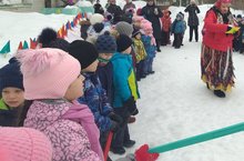 Бәйрәм тантанасы балаларның театральләштерелгән тамашасы белән башланып китте. Балалар бәйрәмнең төп атрибутын - кояш формасында эшләнгән коймакны зурлады.