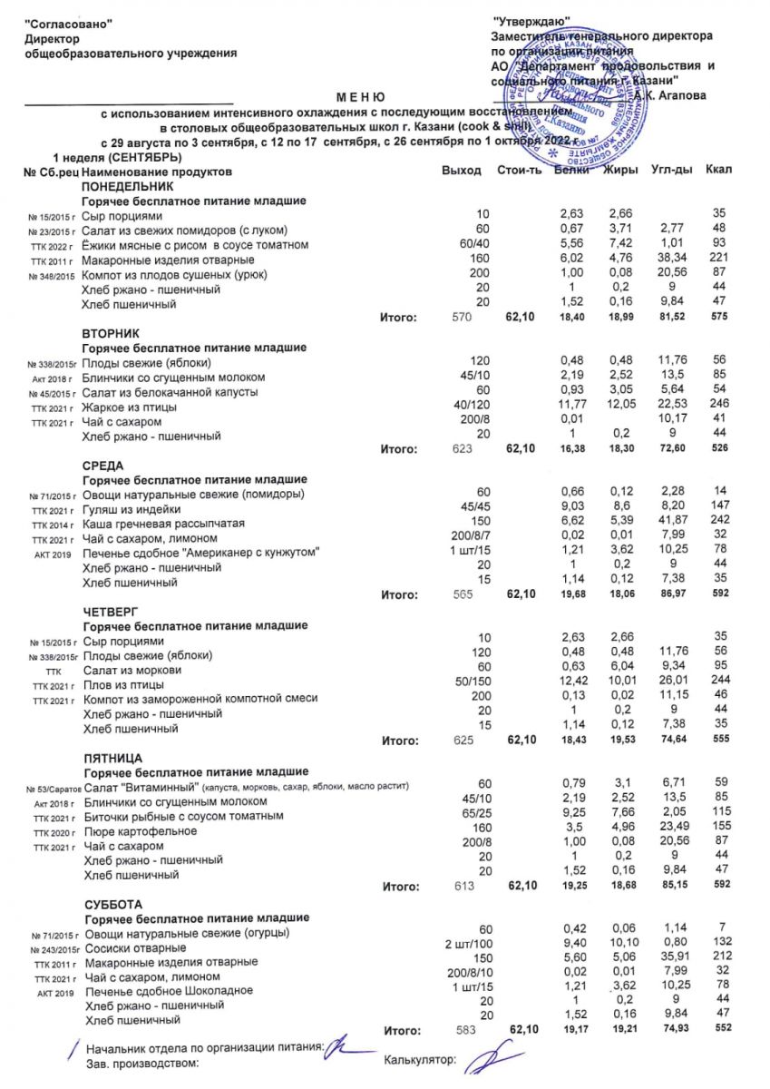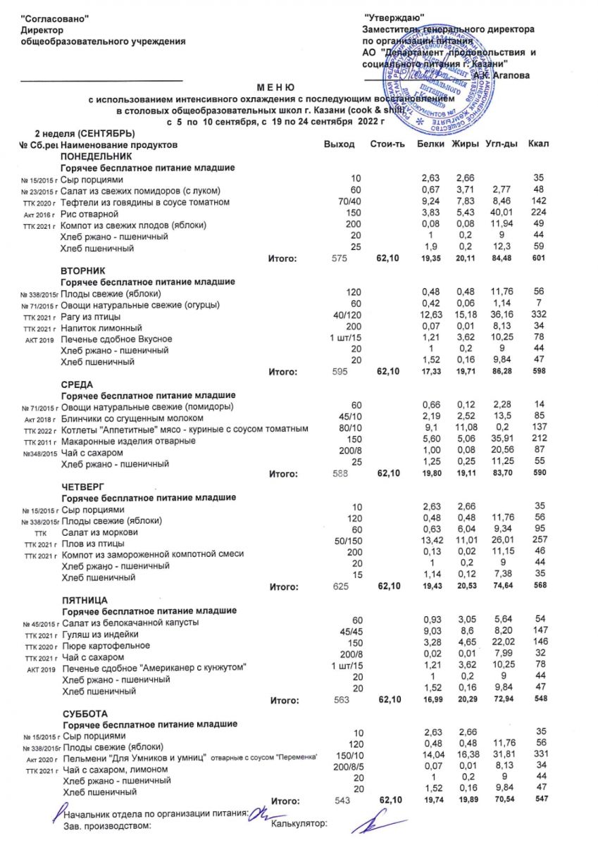 МЕНЮ разрабатывается и определяется на 2 недели АО «Департамент продовольствия и социального питания г.Казани».