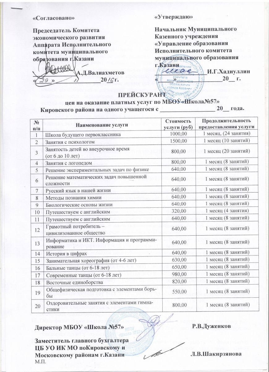 Прейскурант цен на оказание платных услуг по МБОУ "Школа №57