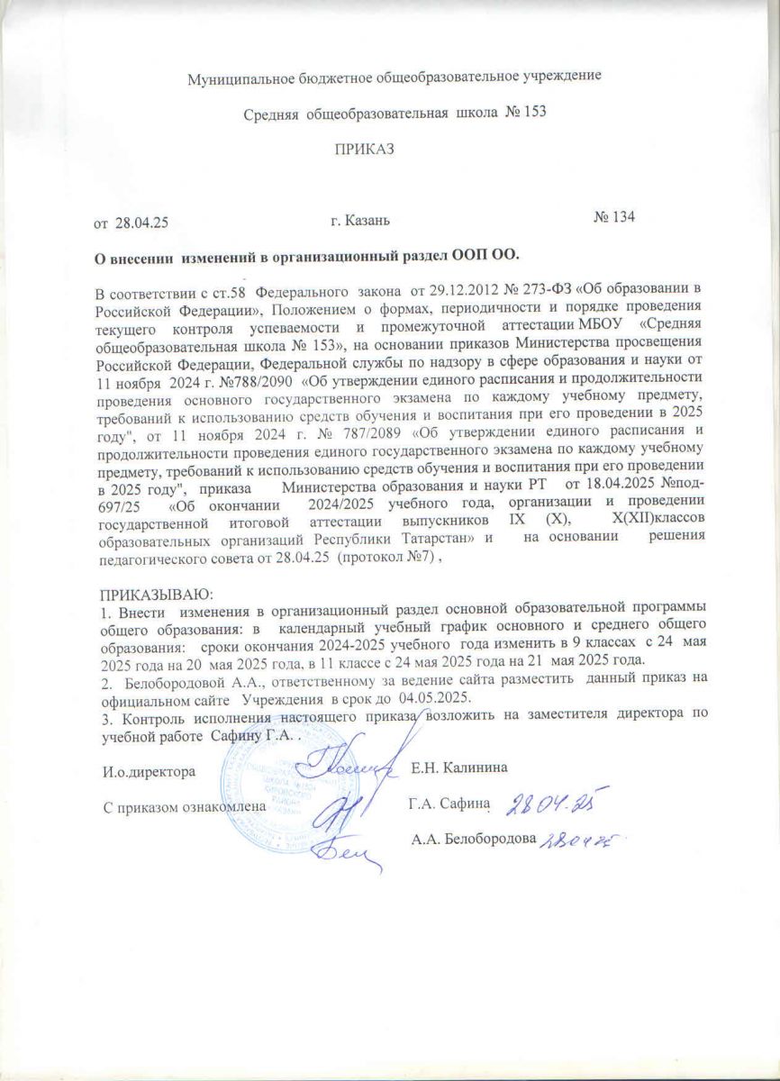 Приказ о внесении изменений в ООП ОО 2024-2025 учебного года