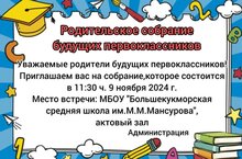 9 ноября в 11:30 ч. в МБОУ "Большекукморская средняя школа им.М.М.Мансурова" в актовом зале состоится родительское собрание будущих первоклассников