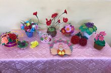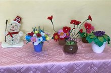 Тематическая выставка «Цветы из разного материала: атласные ленты, бисер, фоамиран, нитки,фетр, ткань,капроновые колготки, гофрированная бумага, мыло, картон, солёное тесто, макаронные изделия»