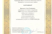75 ЛЕТ ПОБЕДЕ В ВЕЛИКОЙ ОТЕЧЕСТВЕННОЙ ВОЙНЕ. Багавиева Алсу Салимовна-победитель муниципального этапа международного конкурса методических разработок "Уроки Победы"/ Бөек Ватан сугышында Җиңүгә-75 ел. Баһавиева А.С.- "Җиңү дәресе" дигән халыкара методик эшкәртмәләр бәйгесенең район этабында җиңүче 13.01.2020