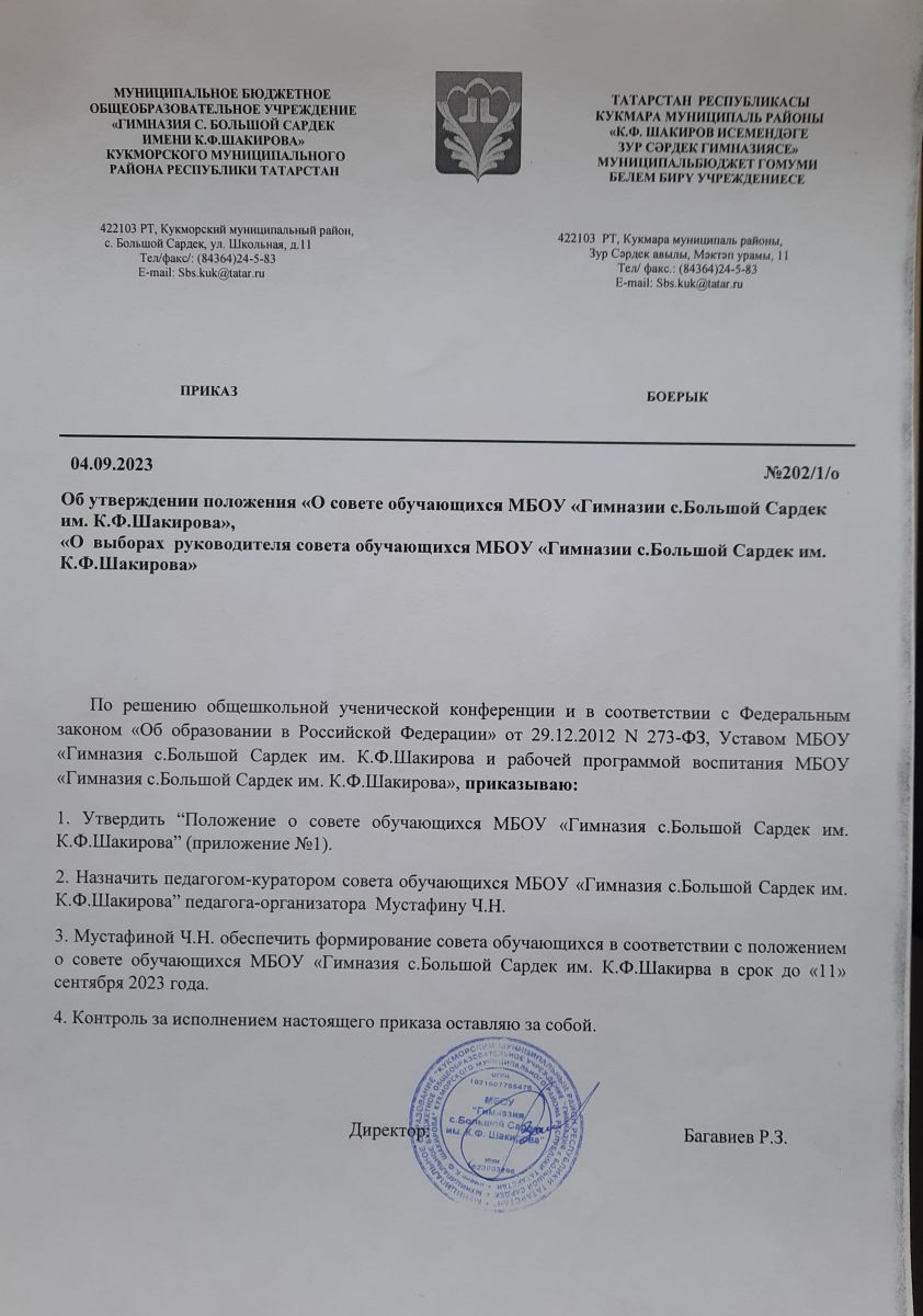 Положение о Совете обучающихся МБОУ "Гимназия с.Большой Сардек им.К.Ф.Шакирова"