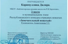 На муниципальном этапе Республиканского конкурса отрядных вожатых "Замечательный вожатый" ученица 10 класса Каримуллина Диляра заняла 2-ое место (руководитель Ахматгалиева Т.Т). Поздравляем!