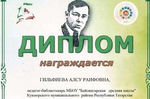 Педагог- китапханәче Гильфиева Алсу Раифовна татар халкының фронтовик-шагыйре Муса Җәлилнең тууына 115 ел уңаеннан үткәрелгән "Җәлилне төрле телләрдә укыйбыз" акциясендә катнашып дипломга лаек булды.