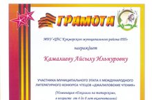 Безнең мәктәп укучысы Камалиева Айсылу "Җәлил укулары" II Халыкара әдәби конкурсының муниципаль этабында катнашкан өчен Грамота белән бүләкләнде.