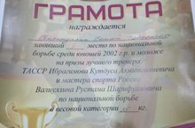 Учащийся нашей школы Каримуллин Самат занял ВТОРОЕ место по национальной борьбе среди юношей 2002 г.р. и моложе на призы лучшего тренера ТАССР Ибрагимова Кутдуса Ахметгалиевича и мастера спорта России Валиуллина Рустама Шарифулловича в весовой категории 35 кг.