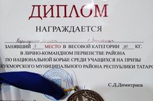 Учащийся нашей школы Каримуллин Самат занял ВТОРОЕ место в весовой категории 30 кг. в лично-командном Первенстве района по национальной борьбе среди учащихся на призы Главы Кукморского муниципального района РТ.