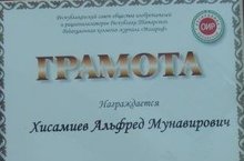 Учитель физики Хисамиев Альфред Мунавирович награжден Грамотой за активное участие в развитие детского технического творчества в Республике Татарстан.