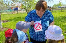 С целью формирования у детей основ безопасного поведения на природе в младшей группе провели занятие «Правила поведения на природе. Воспитатель Ибраева Г.Х. организовала беседу о природе.Прежде чем отправиться на прогулку на природу ребята собрали рюкзак с необходимыми предметами для прогулки. Приходя на природу ребята обнаружили мусор на зеленой траве.Вместе собрали мусор в пакет.Во время сбора мусора воспитатель нечаянно ранила палец. Дети взяли из рюкзака аптечку, обработали рану перекисью, затем помогли приклеить лейкопластырь. Гуляя среди деревьев ребята обнаружили сломанную ветку. Воспитатель предложила вылечить дерево. Ребята с большим энтузиазмом забинтовали ветку и полили водой.