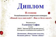 3сыйныф укучысы Галимова Сафия"Яңа ел безгә килә!" республика иҗади конкурсында "Яңа ел эшләнмәләре" номинациясендә 2 урынга лаек булды.Әфәрин!!