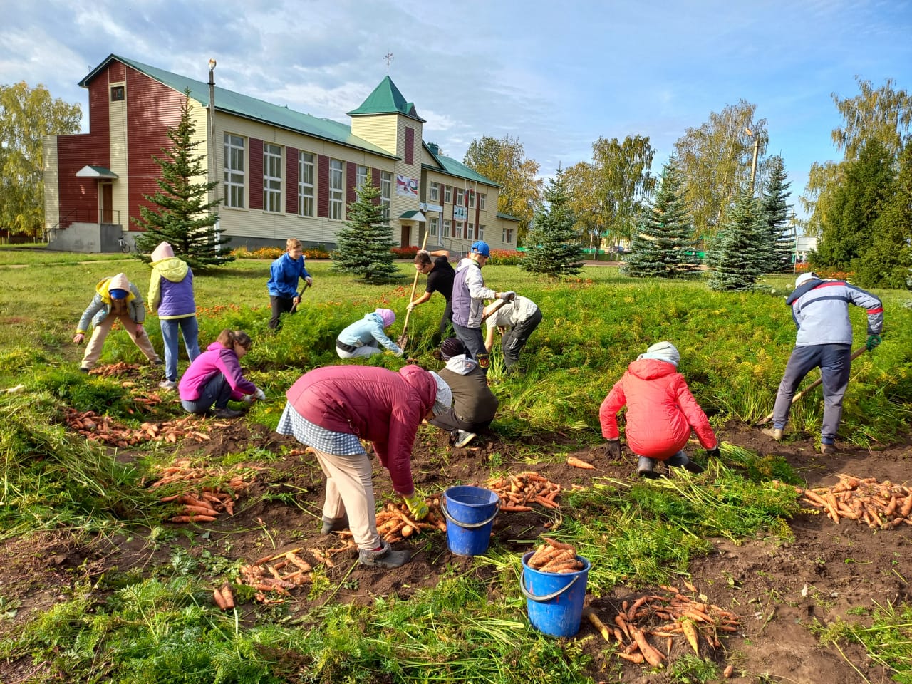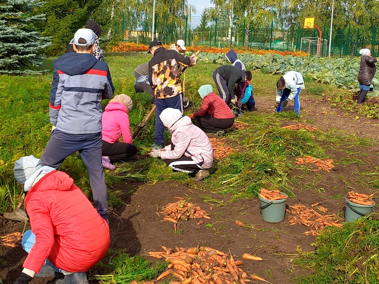 21 сентябрьдә һава торышы безне кояшлы көн белән сөендерде. Без, перчаткалар, чиләкләр, көрәкләр белән коралланып, мәктәп участогында эшләдек, чөгендер, кишер җыештырдык.Барлык укучылар да мәктәп укытучылары белән бергә эшкә җаваплы карадылар, тырышып эшләделәр һәм читкә юнәлмәделәр.Мәктәп участогындагы хезмәт бушка китмәвенә бик шат, безнең уңыш бик яхшы!