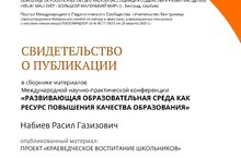 Учитель географии Набиев Расиль Газизович, участвовал в Международной научно – практической конференции «Развивающая образовательная среда как ресурс повышения качества образования» с проектом «Краеведческое воспитание школьников». Этот проект был опубликован в сборнике Международного Педагогического Сообщества «Учительство без границ». Поздравляем нашего педагога Набиева Р. Г. с успехом!