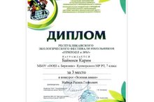 Ученик 7 класса Баймиев Карим участвовал в IX республиканском экологическом фестивале школьников «Природа и мы» и занял 3 место. Поздравляем Карима и его научного руководителя Набиева Р.Г. с победой и желаем дальнейших успехов!