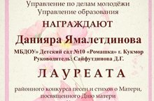 Районда Әниләр көненә багышланган җыр һәм шигырьләр конкурсына йомгак ясалды. Безнең тәрбияләнүчеләрне һәм педагогларны яхшы нәтиҗәләр белән котлыйбыз. Киләчәктә дә уңышлар телибез!