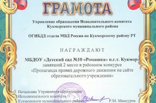 По итогам районного конкурса, организованного Управлением образования Исполнительного конкурса Кукморского муниципального района РТ совместно с ОГИБДД отдела МВД России по Кукморскому району РТ наше МБДОУ "Детский сад №10 "Ромашка" п.г.т.Кукмор" заняло второе место. Поздравляем коллектив!