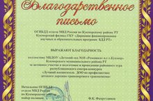 Коллектив нашего ДОУ был награжден Благодарственным письмом ОГИБДД отдела МВД России по Кукморскому району РТ Кукморского филиала ГКУ "Дирекция финансирования научных и образовательных программ БДД РТ" за подготовку и проведение на базе нашего ДОУ III - очного этапа районного тура республиканского смотра-конкурса "Лучший воспитатель ДОО по профилактике детского дорожно-транспортного травматизма".