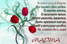 Поздравляем Вас с первым весенним праздником- с Международным женским днем 8 Марта! Желаем вам крепкого здоровья, долгих лет жизни и всего самого наилучшего. Приглашаем Вас на праздничные утренники, посвященные этому прекрасному празднику, которые состоятся: