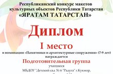 Подготовительная к школе группа приняла участие в Республиканском конкурсе макетов и культурных объектов Республики Татарстан. Под руководством старшего воспитателя Ямаловой Земфиры Ильдаровны группа подготовила макет "Самовар-родник" и стала обладателем диплома 1 степени.
