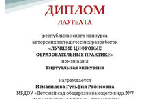 Поздравляем воспитателя Исмагилову Гульфию Рафисовну с дипломом лауреата республиканского конкурса авторских методических разработок "Лучшие цифровые образовательные практики", проведенного Институтом развития образования Республики Татарстан.