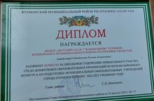 Безнең балалар бакчасы 2022-2023 уку елына Кукмара шәһәре муниципаль белем бирү учреждениеләрен әзерләү буенча район конкурсы нәтиҗәләре буенча мәктәп яны участогын үрнәк итеп күрсәткән өчен 3 нче дәрәҗә диплом белән бүләкләнде.