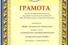 Безнең балалар бакчасының мәктәпкә әзерлек төркемендә тәрбияләнүче Мәрдиева Сабрина (җит.Хәкимуллина Р. Р.) "Созвездие - Йолдызлык-2022" эстрада сәнгатенең ел саен үткәрелә торган ачык республика телевизион яшьләр фестивале кысаларында үткәрелгән "Кукмара йолдызчыклары-Кукмарские звездочки" муниципаль эстрада сәнгате фестивалендә 2 нче урынга лаек булды.
