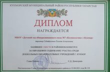 Бүген район мәдәният йортында Татарстан Республикасы Кукмара муниципаль районы мәгариф хезмәткәрләренең август киңәшмәсенең пленар утырышы узды. Белем бирү учреждениеләрен яңа уку елына әзерләү муниципаль бәйге нәтиҗәләре буенча безнең балалар бакчасы Кукмара шәһәре балалар бакчалары арасында участокларның үрнәк торышы өчен 1 нче урынны яулады. Участокларны төзекләндерүдә тәрбияләнүчеләрнең ата-аналарына һәм бөтен тату коллективыбызга зур рәхмәтебезне белдерәбез!