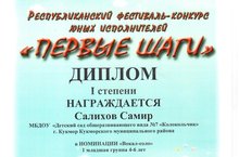 Мәктәпкә әзерлек төркеме тәрбияләнүчесе Салихов Самирны "Беренче адымнар" (җит.Исмәгыйлова Г. Р., Хәбибуллина С. Р.). Республика бәйгесендә җиңүе белән котлыйбыз! Җыр сәнгатендә яңа уңышларга ирешүен телибез!