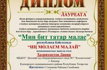 Хаҗияхметов Данирны (җит.Степанова Р.С.), дистанцион формада узган, "Мин бит татар малае" республика бәйгесенең "Иң мөлаем малай" номинациясендә җиңүе белән котлыйбыз!