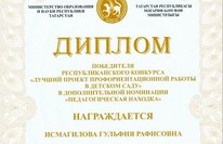 МБУ "Информационно-методическим центром" г.Набережные Челны совместно с МАУ ДО "Городской дворец творчества детей и молодежи №1" г.Набережные Челны был проведен Открытый региональный конкурс методических разработок, мероприятий профориентационной направленности "Я б в рабочие пошел", в котором приняли участие и воспитатели нашего дошкольного учреждения (Исмагилова Г.Р., Гадиева Л.М.) и были удостоены 2 места в номинации "Проект".