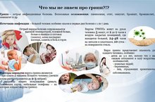 Грипп - острая инфекционная болезнь. Возможные осложнения: пневмония, отит, синусит, бронхит, бронхиолит, менингит и др. Источник инфекции - больной человек, особенно опасен в первые дни болезни с 1 по 7 день. Острый период болезни сопровождается высокой температурой, головной болью, болью в мышцах и суставах (ломота), затем последуют насморк, кашель и боль в горле.