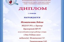 Наша воспитанница Исмагилова Лейла ( рукокодитель Исмагилова Г.Р., Тимергалиева Э.И.) приняла участие в Республиканском конкурсе исследовательских работ и проектов детей старшего дошкольного возраста "Дебют в науке", проходившем в г.Нижнекамске. Она провела исследовательскую работу в секции "Это Родина моя" на тему "Все лучшее в Кукморе". Члены жюри высоко оценили выполненную работу. По итогам конкурса Лейла набрала наибольшее количество баллов и заняла 1 место. Поздравляем, творческих успехов и новых побед!!!