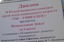 Воспитанница подготовительной к школе группы нашего детского Исмагилова Лейла (рук-ль Исмагилова Г.Р.) приняла участие в заочном туре II Республиканского конкурса среди детей дошкольного возраста "Ты - уникален" в номинации "Познавательное развитие" и набрав максимальное количество баллов прошла на очный тур конкурса, который прошел в г.Менделеевск. Члены жюри высоко оценили знания и умения Лейлы в данном направлении. тем самым она заняла 1 место. Поздравляем ее с победой и желаем ей дальнейших успехов!!!