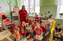 Бүген 1 нче көн-кызыл, бик кызыклы үтте! Балалар кызыл флаглар белән зарядка ясадылар, башларына кызыл капчыклар куеп, сукмак буйлап йөрделәр һәм, әлбәттә инде, кызыл киемнән уртак фото ясалды. -