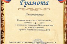 23 декабря 2014 года воспитанники подготовительной к школе группы побывали в школе №4. Где состоялась спортивные игры "Веселые старты" с Дедом морозом возле ёлки. Команда нашего детского сада заняла 1 место и была награждена грамотой и подарками. Они получили заряд энергии и положительные эмоции. Детям было интересно, они остались довольными.