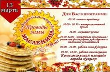 13 март көнне Комсомол мәйданында " Масленица.Кышны озату " сезне зур күңел ачу программасы һәм концерт көтә. Барыгызны да бәйрәмгә көтәбез!