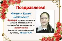 Фомина Юлия, ученица 7 класса, стала призером муниципального этапа всероссийской олимпиады школьников по математике (учитель Мурзин Н.М.) Поздравляем! Молодец! Желаем дальнейших успехов.