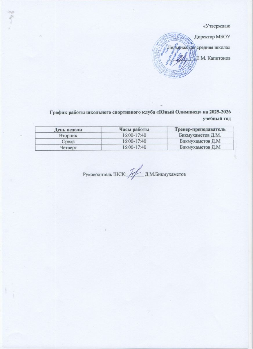 Расписание работы школьного спортивного клуба "Юный олимпиец" на 2025-2026 учебный год