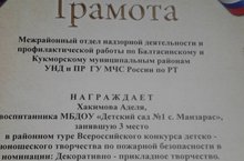 Поздравляем Хакимова Аделя занявшую 3 место в районном туре Всероссийского конкурса детско-юношеского творчества по пожарной безопасности в номинации: Декоративно-прикладное творчество.