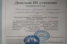 Бөек Җиңүнең 75 еллыгы, Кукмара районы төзелүенең 90 еллыгына һәм Татарстан АССР төзелүенең 100 еллыгына багышланган ике дәүләт теленә өйрәтү буенча иң яхшы дидактик уен конкурсында”Бөек җиңүгә -75 ел” номинациясендә тәрбиячебез Давлетшина Гөлнара Салих кызы 3 нче дәрәжәле Диплом белән бүләкләнде.