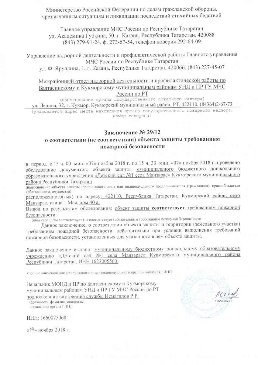 Заключение о соответствии объекта защиты обязательным требованиям пожарной безопасности