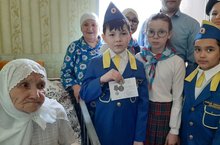 Воспитанники отрядов "Юные патриоты", "Волонтеры Победы" и ЮИД посетили труженника тыла Разяпову Савдию Разяповну и вручили юбилейную медаль "75 лет Победы в Великой Отечественной Войне 1941-1945". Дочь Савдии Разяповны Суфия Валеевна гостеприимно приняла гостей и за чашкой чая рассказала о нелёгкой судьбе своей мамы в годы войны.