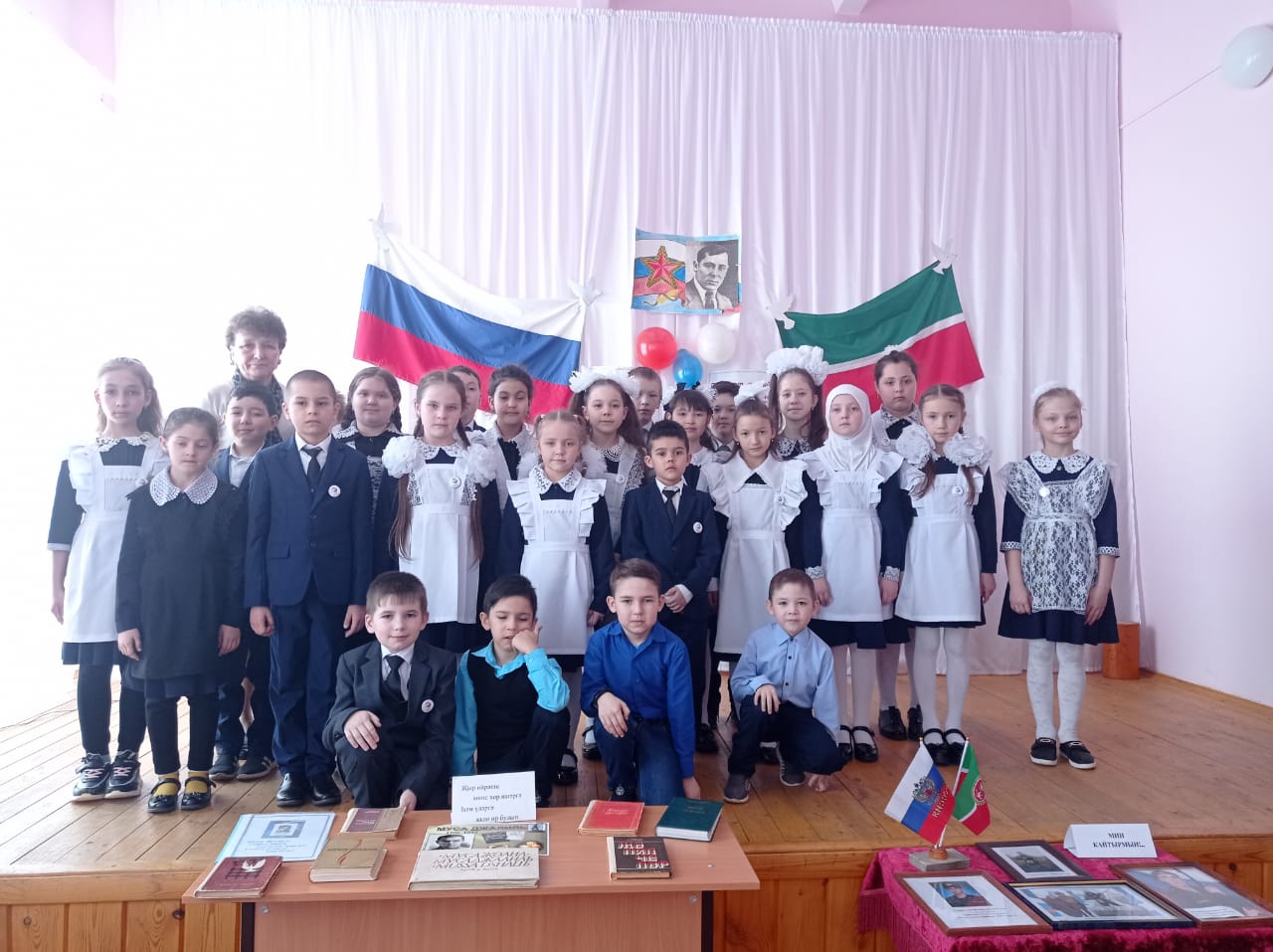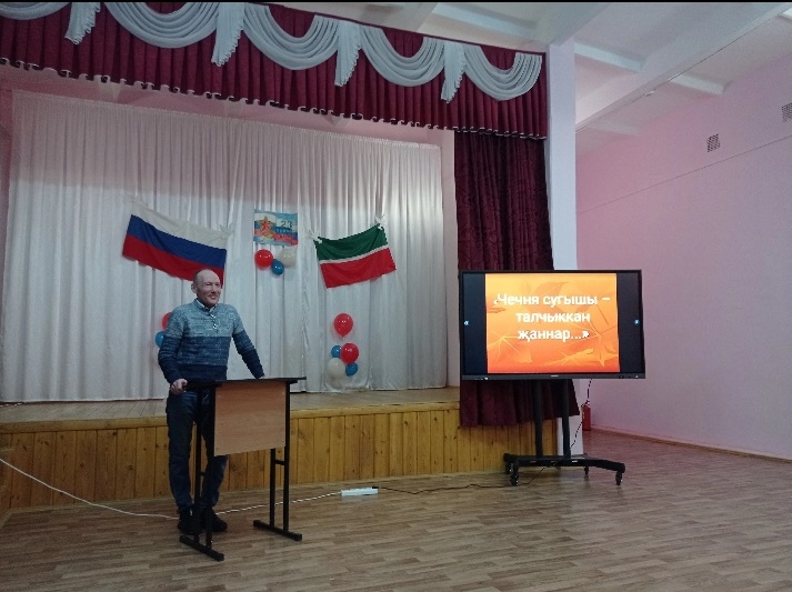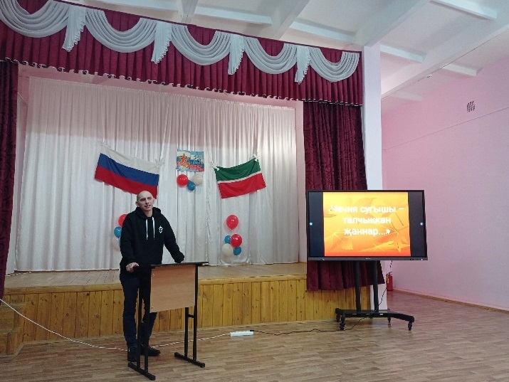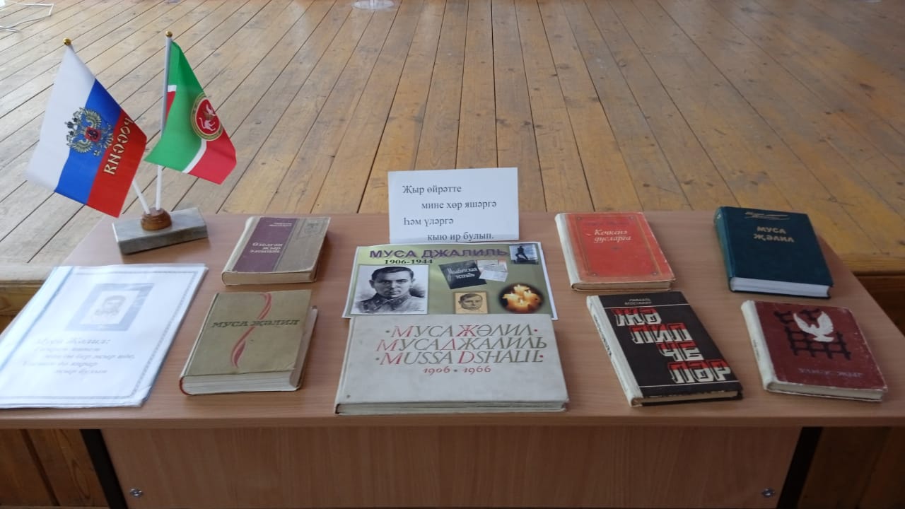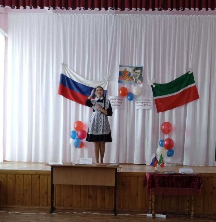 Патриотик тәрбия айлыгы дәвам итә. Шушы айлык кысаларында китапханәче патриот шагыйрь Муса Җәлилнең туган көненә багышланган "Мәңге үлмәс, Муса, синең җырын!" дигән әдәби кичә оештырды. Иң элек кыскача шагыйрьнең тормыш юлы, эшчәнлеге белән таныштырды. Кичәнең өлеше шагыйрьнең шигырьләрен сәнгатьле итеп сөйлэү иде. Һәр сыйныф бу бәйгедә актив катнашты. Шулай ук "Җыр өйрәтте мине хөр яшәргэ, һәм үләргә кыю ир булып" дигән шагыйрьнең китапларыннан күргәзмә оештырылды.