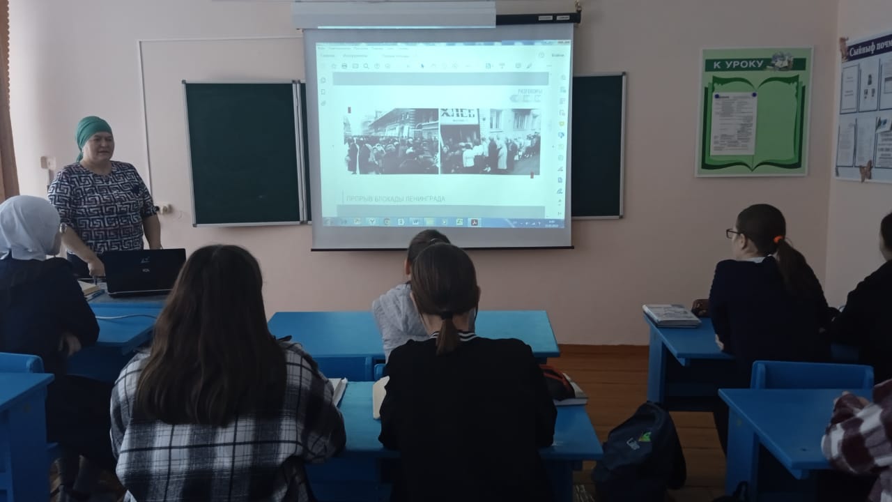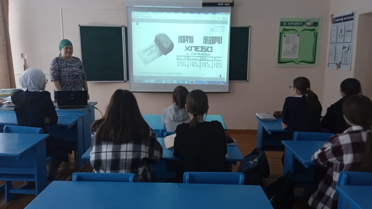 Гыйнвар аенда илебез, халкыбыз сугыш елларында булган коточкыч вакыйгаларны - Ленинград блокадасын искә ала. Быел Ленинград блокадасының өзелүенә 80 ел тула. Әлеге дата уңаеннан өлкән сыйныфларда "Ленинград блокадасының алга китеше" дигән темага сыйныф сәгате уздырылды. Әңгәмәдән соң укучыларга блокада, фаҗигале вакыйгалар, "Яшь гвардия" төркеме турында кинохроника кадрлары тәкъдим ителде. Блокадалы икмәк турындагы видеороликка аерым тукталдылар. Бу махсус продукт - тормыш символы, зур хәтер билгесе. Фикер алышудан соң укучылар ул еллардагы геройлар, Ленинград блокадасы халкының фаҗигасе турында онытырга ярамый дигән нәтиҗәгә килделәр һәм мондый геройлардан үрнәк алырга кирәк дигән нәтиҗәгә килделәр.