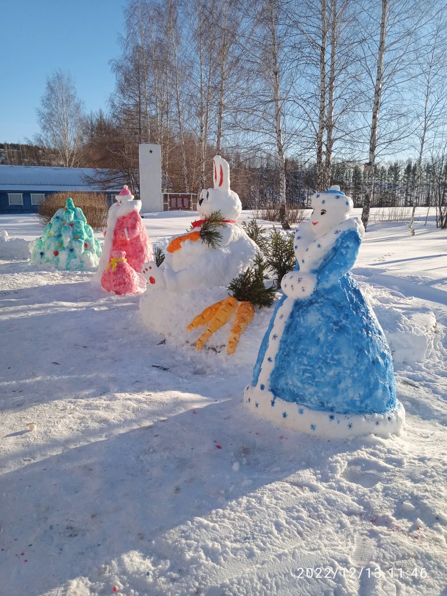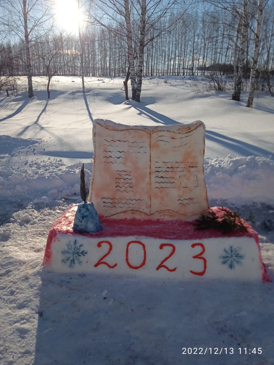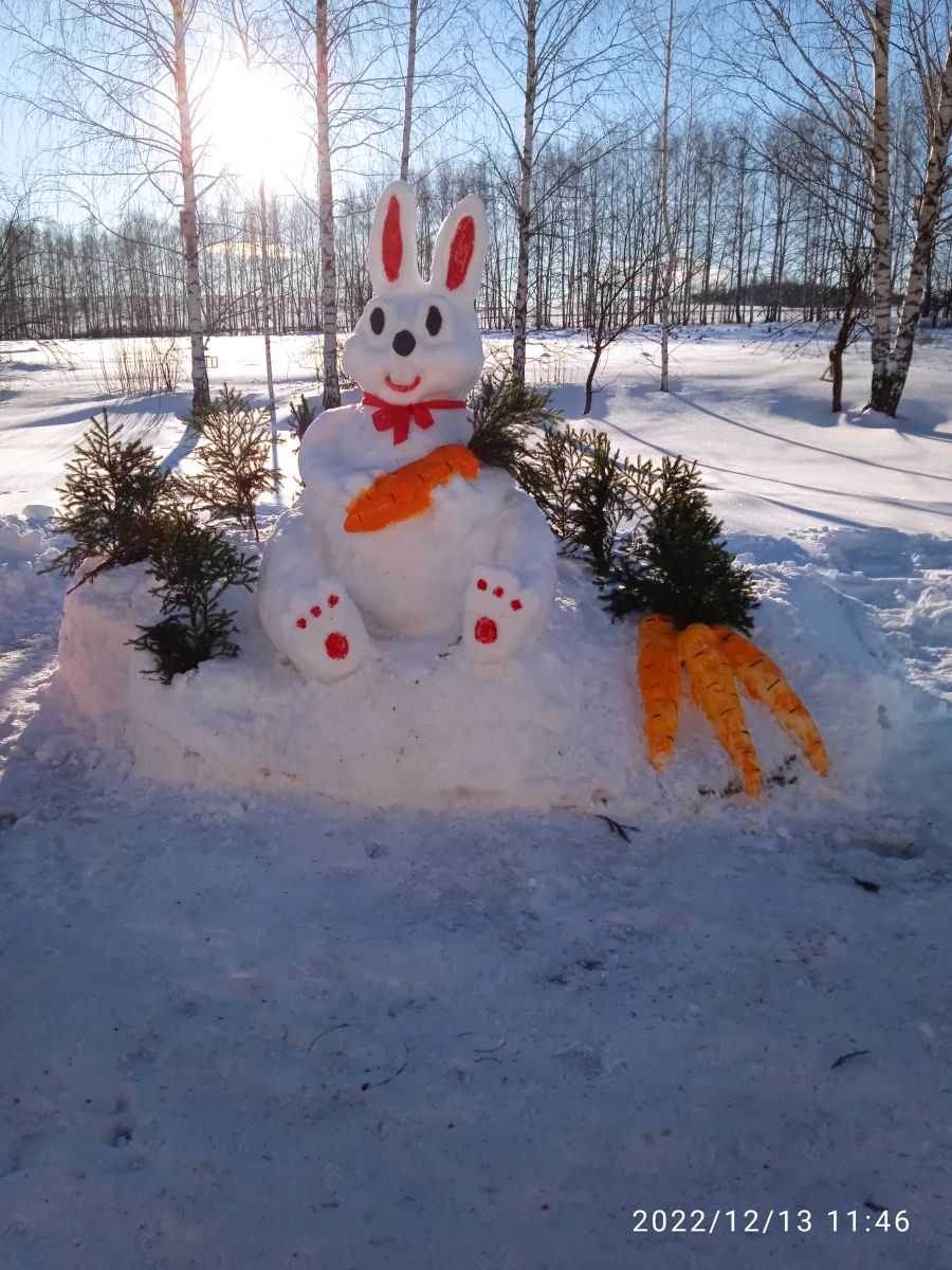 Мәктәбебез территориясенә яңа ел символы Йомшак Куян сыннары, яшел чыршылар һәм җәнлекләр белән бизәлде. Иң түрдә - 2023нче ел, Россиядә Укытучы һәм остаз елы символы булырлык, ачык китап белән каләм тора.