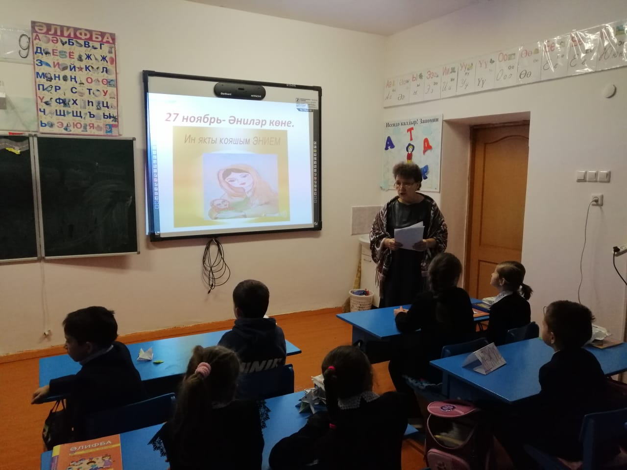 Бүген мәктәбебездә "Иң ягымлы, иң сөйкемле - син ул, әнием!" дигән Әниләр көненә багышланган атналык игълан ителде. Бүген һәр сыйныфта "Әнием -алтыным, минем иң якыным!" дип исемләнгән сыйныф сәгатьләре булып узды. Китапханәче Мухаметзянова Альбина Мәүлит кызы "Айдан, кояштан кадерле - син ул, әнием!" дигән исем астында китап күргәзмәсе оештырды. Пелагог-оештыручы атналык планы белән укучыларны алдан ук таныштырды. Алар бәйгеләргә инде әзерлекне башлаганнар иде. Мәктәп фоесында урнашкан почта ящигына әниләргә юлланган хатлар, шулай ук матур эчтәлекле, бизәлешле открыткалар бәйгесе дә старт алды. Укучылар атна буе мавыктыргыч чара, бәйгеләрдә актив катнашырлар дип ышанып калабыз. Чөнки, әниләр һәркем өчен иң кадерле кешеләр.